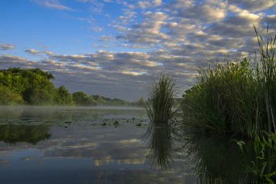 Облака и туман на рассвете. Озеро Студёное, Мещера.